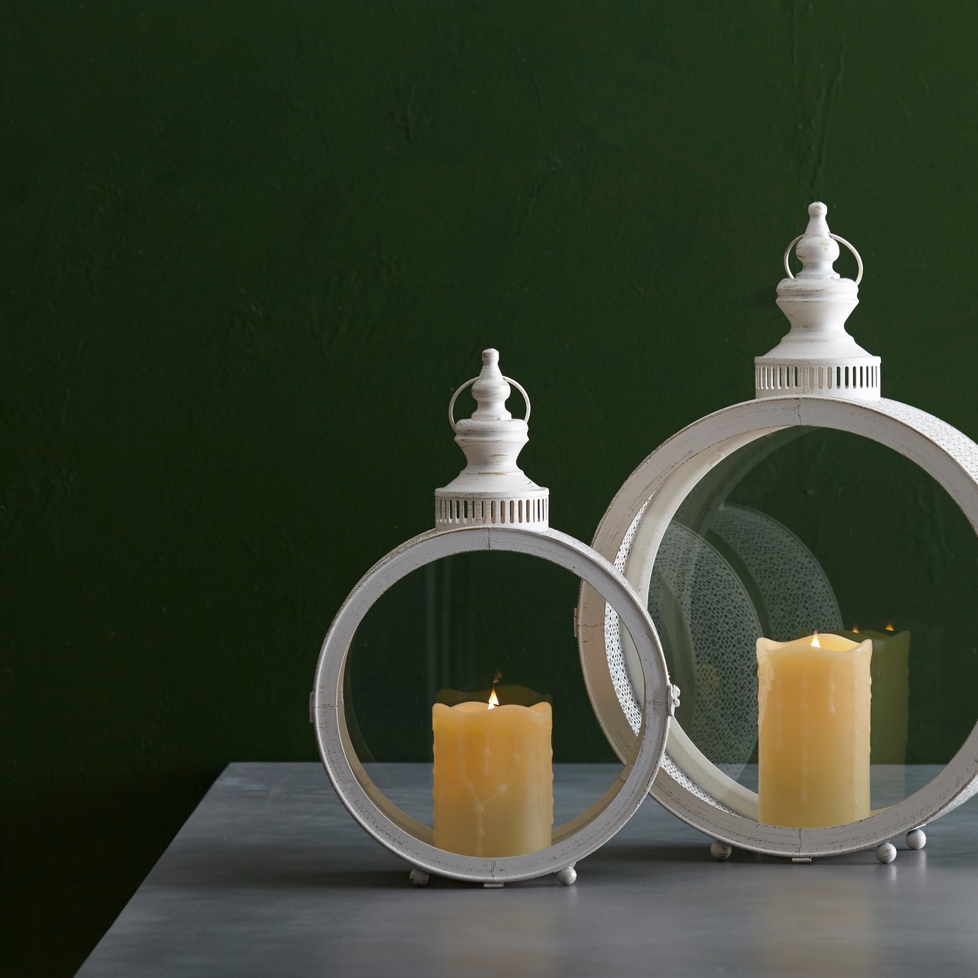 Elevate your home decor with the timeless charm of this Ivory Ornate Metal Circle Lantern. Featuring an intricate design and a classic ivory finish, this lantern adds a touch of elegance to any setting. Whether placed as a stunning table centerpiece, a welcoming entryway accent, or a sophisticated mantle decoration, its sturdy metal and glass construction ensures durability for years to come. Perfect for both everyday styling and seasonal displays, simply add a wax or LED candle to create a warm, inviting glow.