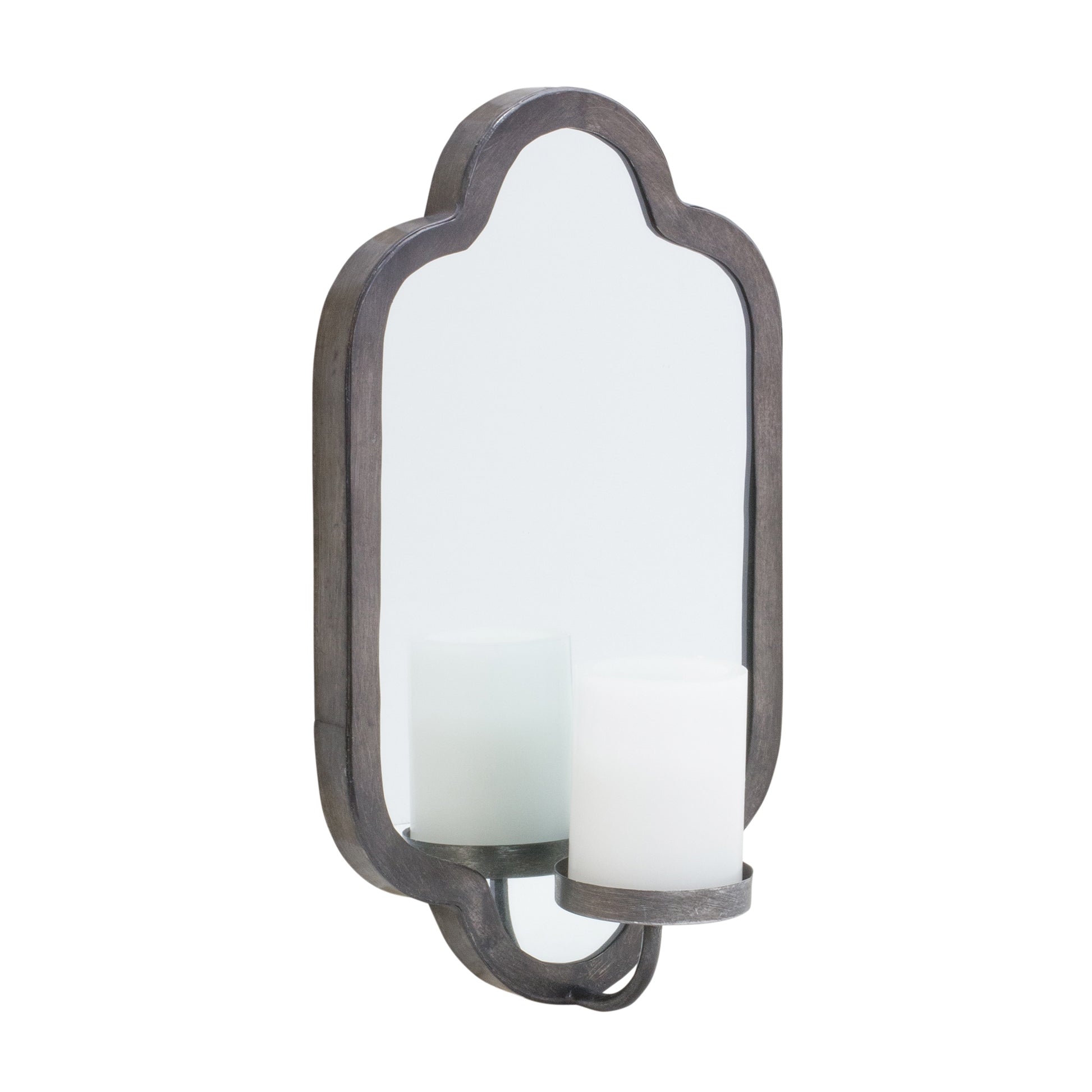 This set of two mirror wall sconces combines elegance and functionality to elevate any space. Each sconce measures 9.25" wide by 15.75" high and features a beautifully shaped iron frame with an integrated glass mirror that reflects light for added warmth and ambiance. The built-in candle holder creates a cozy, inviting glow, making them perfect for hallways, living rooms, dining areas, or entryways. Crafted from durable iron and glass, these sconces offer timeless style and lasting quality for your home décor.