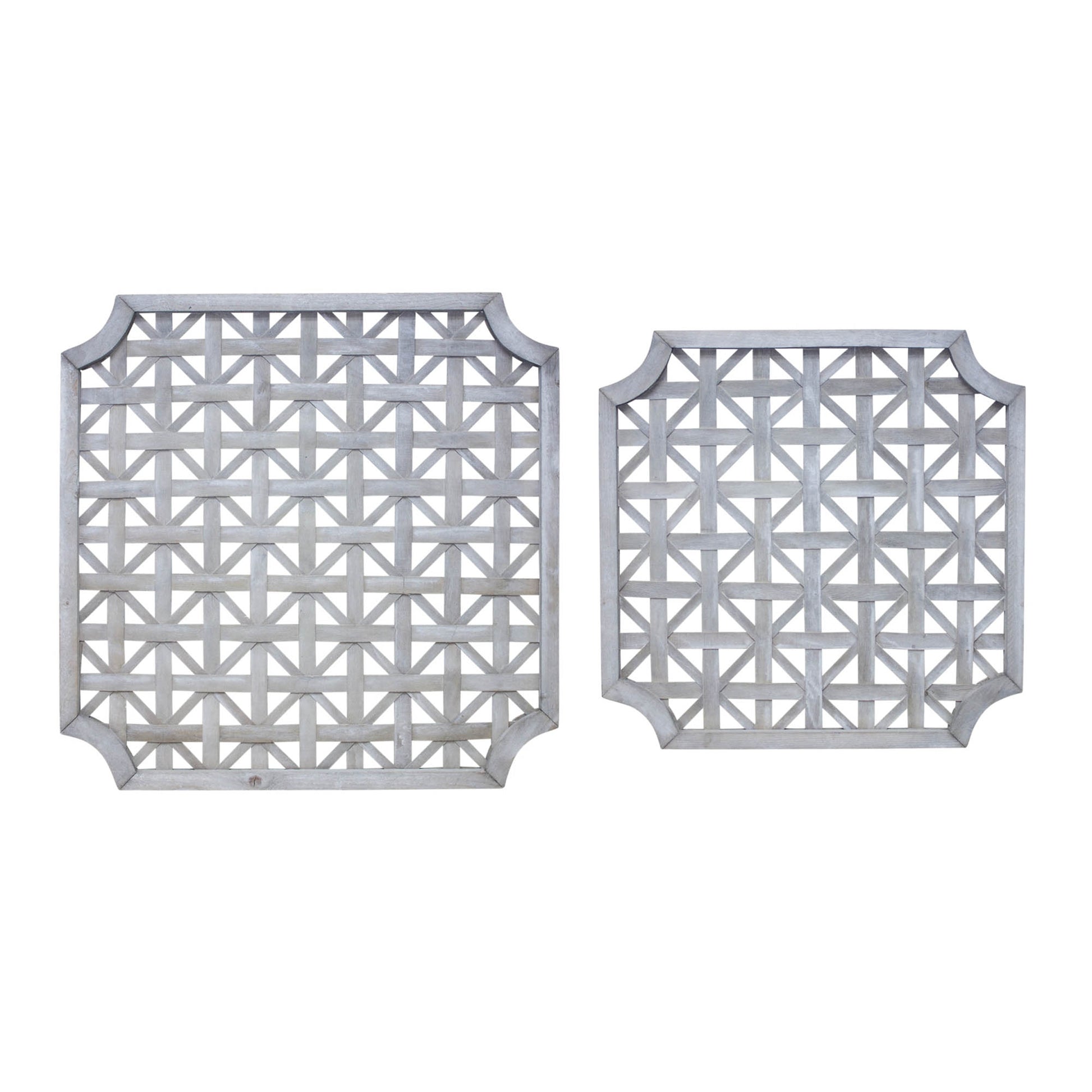 Bring warmth and texture to your home with this set of Woven Wood Square Wall Hangings. Crafted from natural wood in a soft grey and white finish, each piece showcases a geometric woven design that adds depth and dimension to your wall decor. Display them together for a striking focal point or separately to add subtle charm to different rooms. Perfect for farmhouse, rustic, or modern cottage styles, these wall hangings also make a great base for layering with wreaths or framed prints. Sold in a set of two assorted sizes to create a balanced and memorable display in your home.